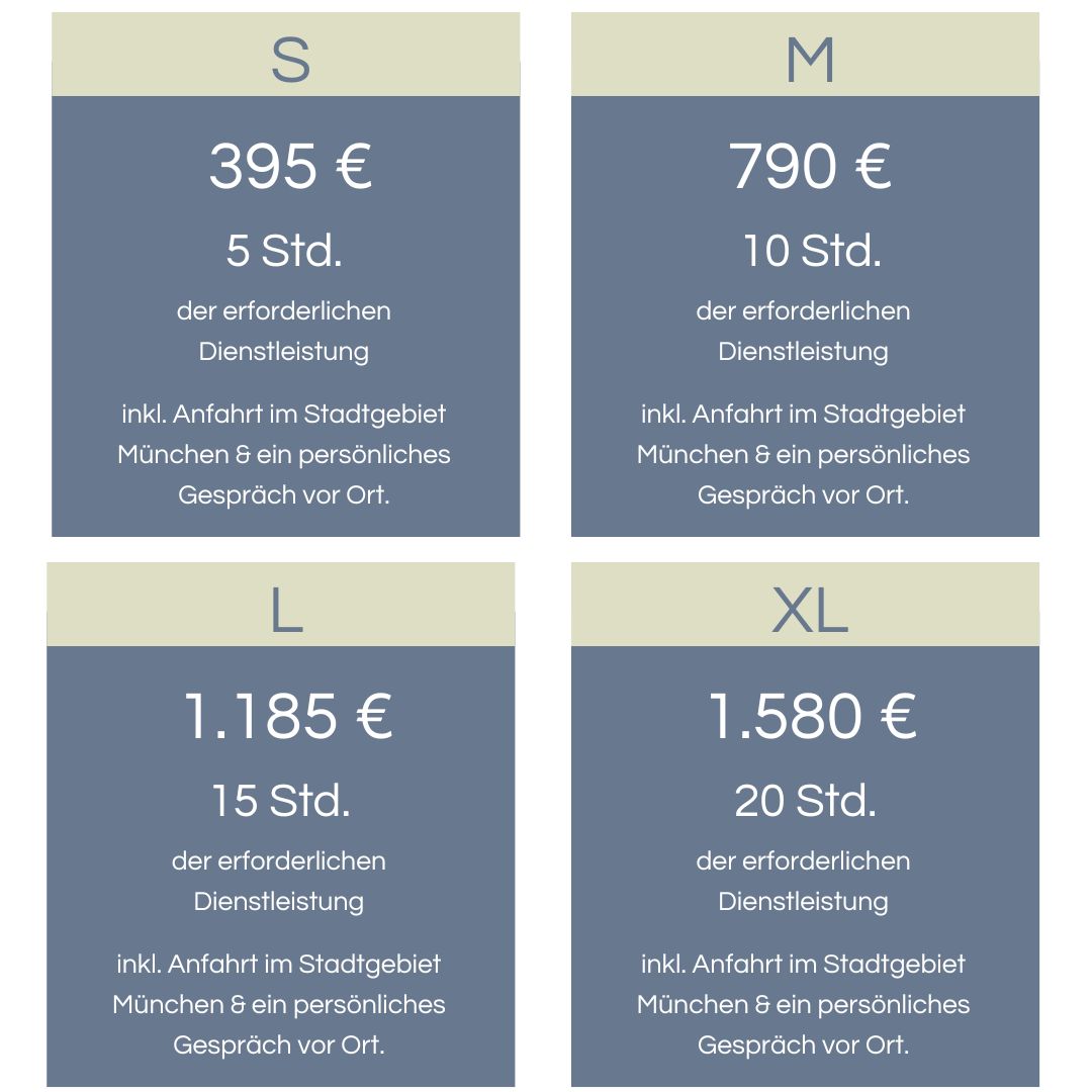 Die Dauer meines Einsatzes ist schwer zu kalkulieren und die gemeinsame Arbeitszeit ist individuell. Sie kann einige Stunden, aber bei Unterbrechungen auch mehrere Wochen betragen. Bei einem unverbindlichen Vorbesuch lernen wir einander kennen und bei der Sichtung aller Räumlichkeiten gewinne ich einen Eindruck über die mögliche Dauer unserer Zusammenarbeit.